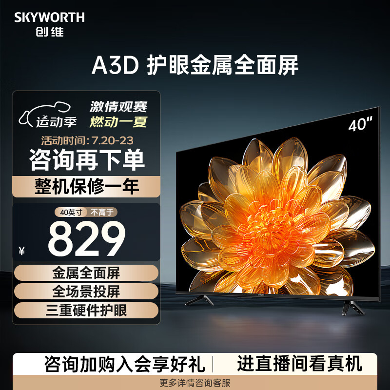 创维电视40A3D 40英寸电视机金属屏智能投屏三重硬件护眼平板液晶家用彩电43 32价格:829.00元!