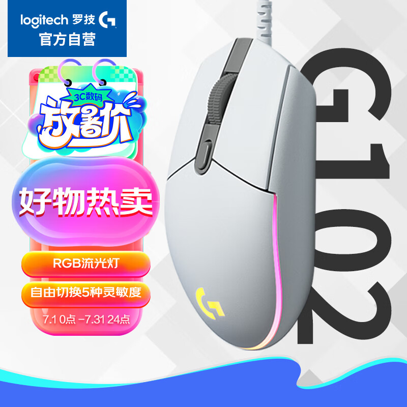 罗技(G)G102 游戏鼠标 白色 RGB鼠标 吃鸡鼠标 绝地求生 轻量化设计 200-8000DPI G102第二代价格:109.00元!