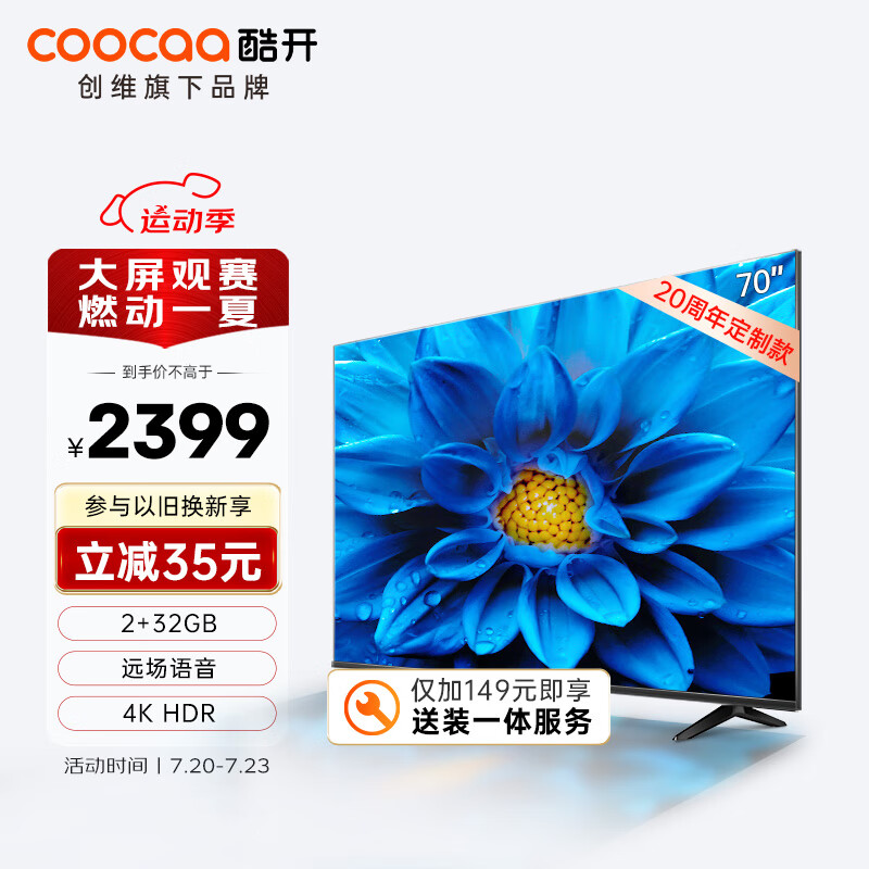 酷开创维J3 70英寸电视 4K超清 2+32G大内存 远场语音声控 无频闪 金属屏 平板电视机以旧换新70J3价格:2399.00元!