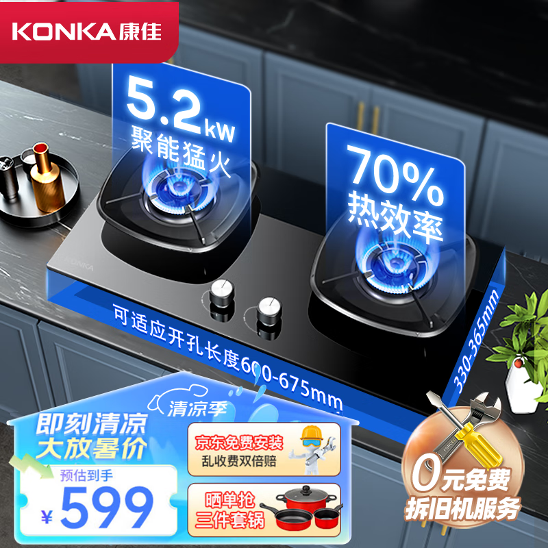 康佳(KONKA)燃气灶煤气灶双灶家用 5.2kW天然气嵌入式台式灶具 70%高热效率 聚能炉架JZT-B520YG(天然气)价格:599.00元!