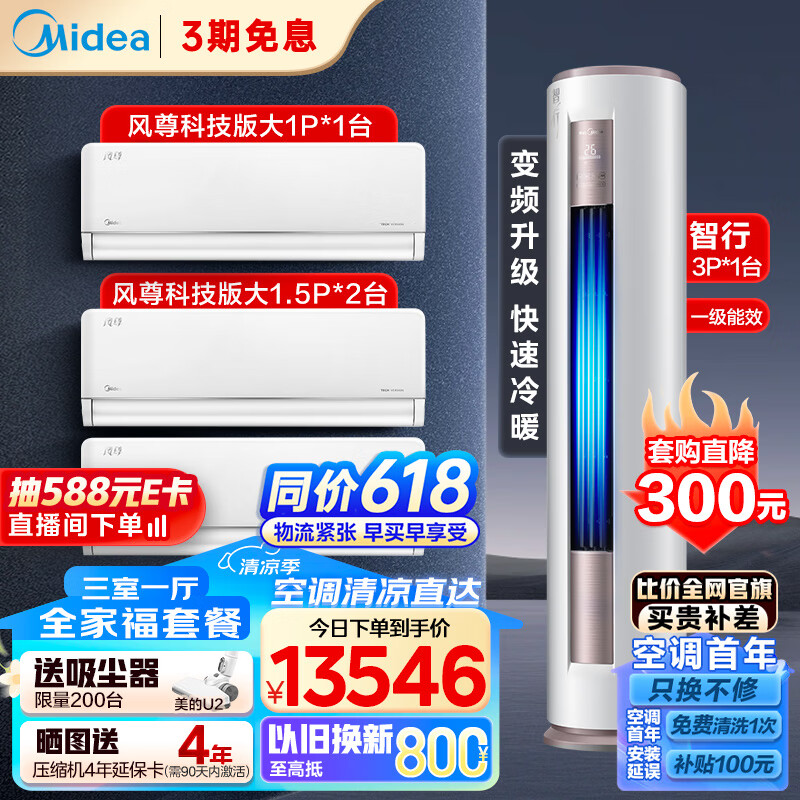 美的(Midea)空调套装 三室一厅(大1匹风尊科技一级+1.5匹风尊科技一级挂机*2+3匹智行柜机一级)一套购齐价格:13546.00元!