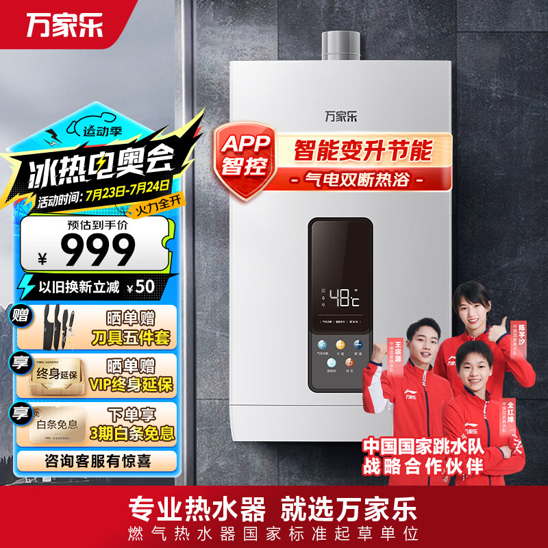 万家乐13升燃气热水器天然气节能省气智能变升恒温气电双断多重防冻APP控制JSQ26-13DP3(F)以旧换新价格:999.00元!