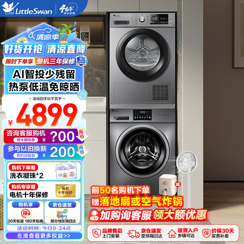 小天鹅(LittleSwan)洗烘套装10kg滚筒洗衣机全自动+热泵烘干机 智能投放 智能WIFI控制 V23+TH100VCH032W价格:4899.00元!