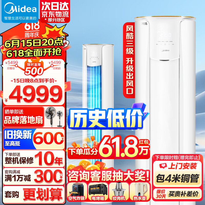 美的(Midea)空调3匹风酷三级能效变频冷暖客厅空调立式大风口落地式圆柱空调柜机 KFR-72LW/N8MJC3 多仓直发价格:4999.00元!