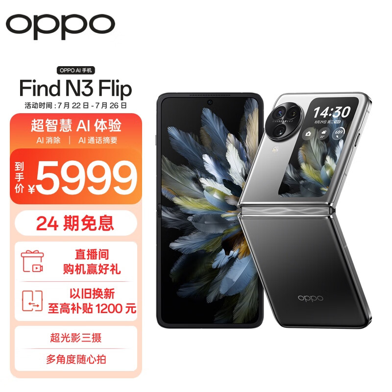 OPPO Find N3 Flip 12GB+256GB 镜中之夜 超光影三摄 专业哈苏人像 120Hz屏 5G 拍照 AI 小折叠屏手机价格:5999.00元!
