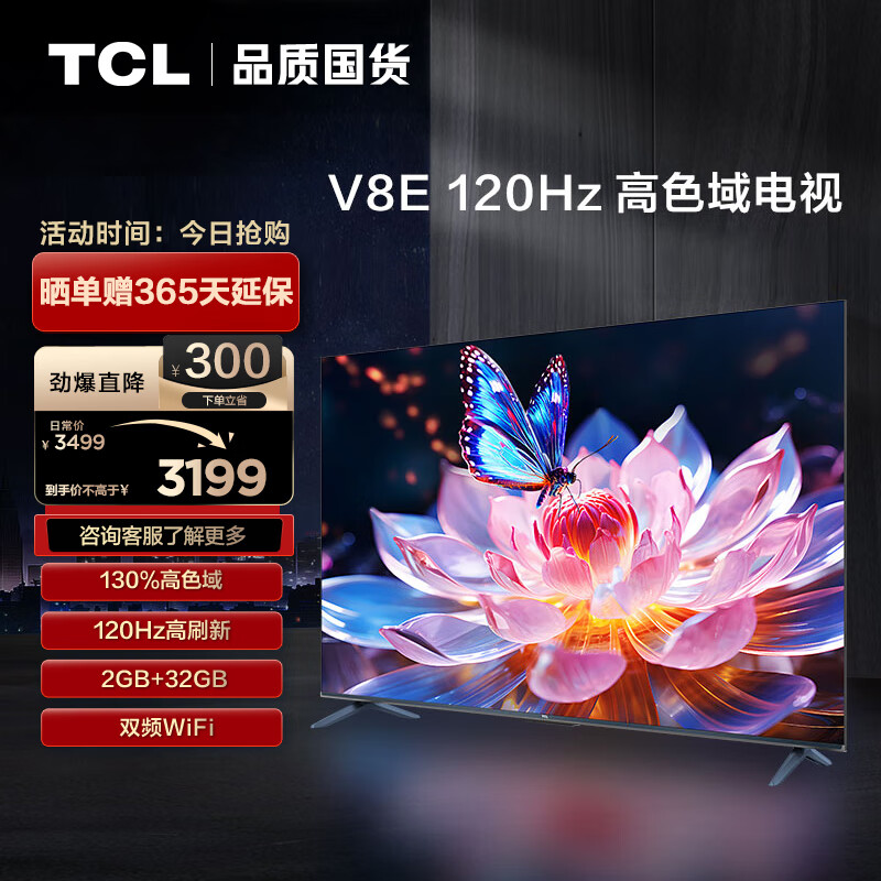 TCL电视 75V8E 75英寸 120Hz 高色域 2+32GB MEMC防抖大屏 4K高清 客厅液晶智能平板电视机价格:3199.00元!