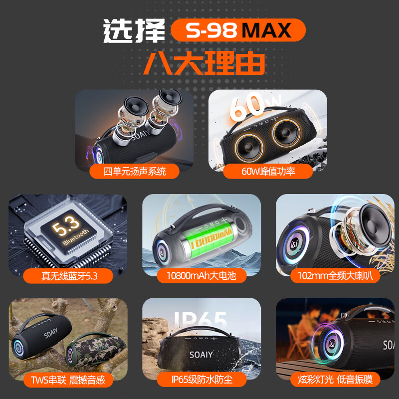 索爱(soaiy)S98MAX大战鼓蓝牙音箱大喇叭60W功率超重防水低音炮大音量便携式广场舞车载户外露营电脑U盘音响价格:569.00元!