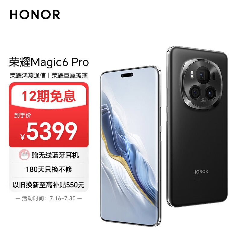 荣耀Magic6 Pro 荣耀鸿燕通信 单反级荣耀鹰眼相机 第三代骁龙8芯片 12GB+256GB 绒黑色 5G AI手机价格:5399.00元!