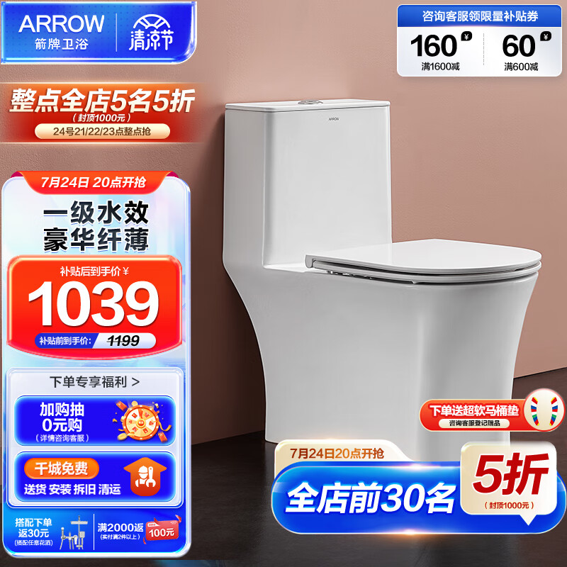 箭牌(ARROW)马桶家用卫浴虹吸抽水坐便器普通坐厕 全管施釉 豪华纤薄AE1182L价格:1799.00元!