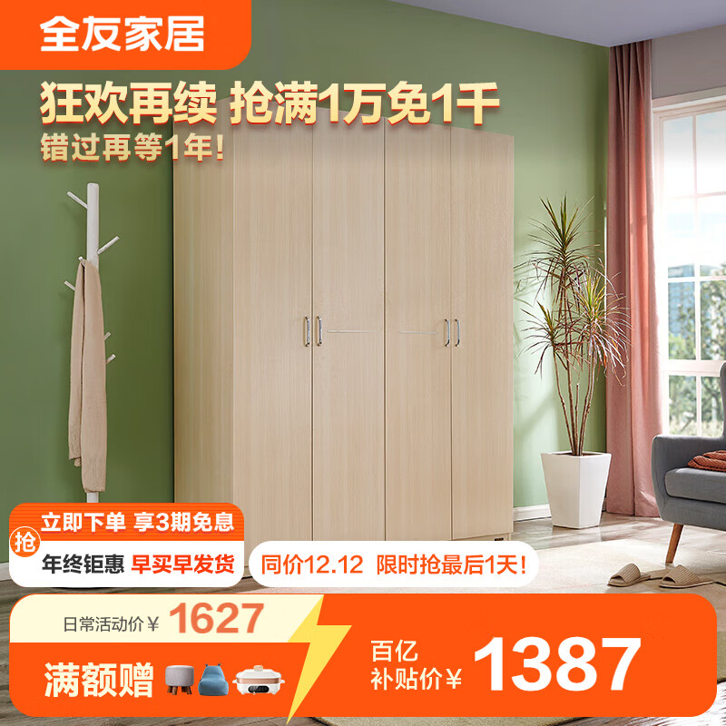 全友家居 衣柜现代简约平开门衣柜卧室家具四门大衣柜106302 四门衣柜价格:1387.00元!