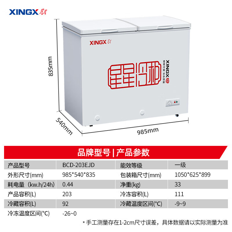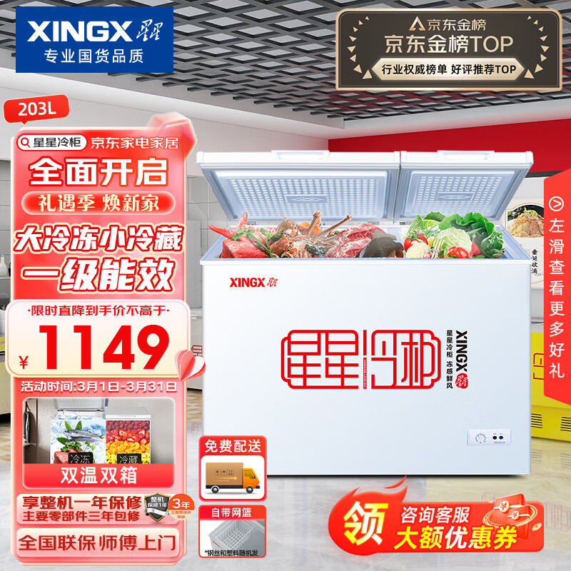 星星(XINGX) 203升 家用商用双温冰柜 双箱冷柜 左冷冻右冷藏冰箱 顶开门大容量 BCD-203EJD价格:1099.00元!