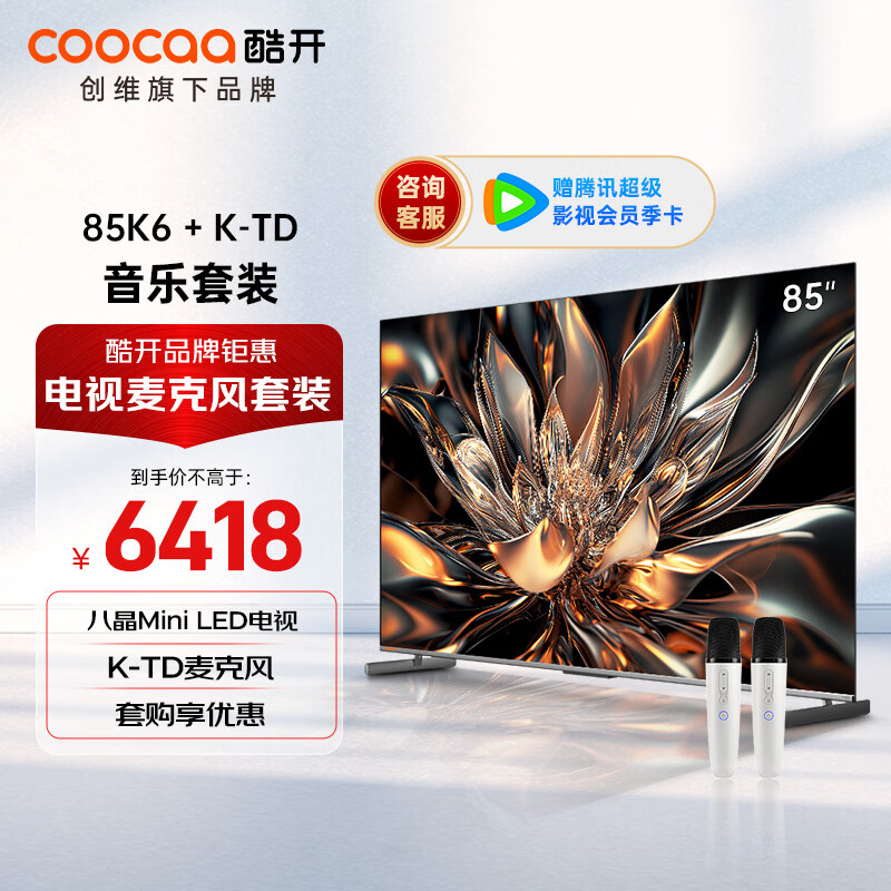 酷开创维85K6 85英寸八晶Mini LED电视机+K-TD麦克风套装 K歌电视 家庭KTV无线唱歌 双支麦克风价格:6418.00元!