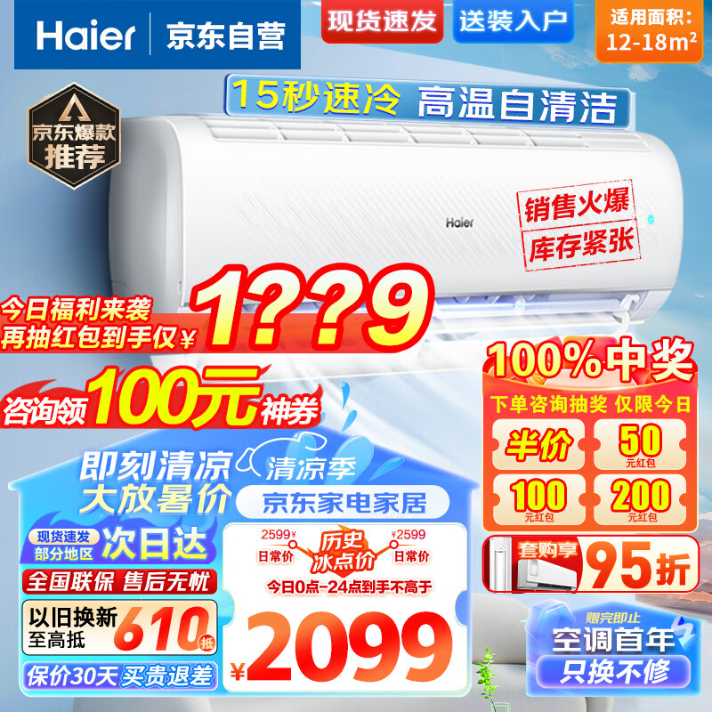 海尔(Haier)空调1匹挂机新一级能效变频速冷暖大一匹智控光感护眠自清洁防直吹家用卧室壁挂式空调以旧换新价格:2099.00元!