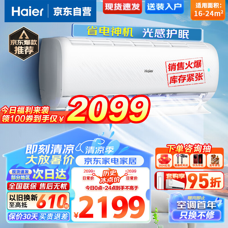 海尔(Haier)空调1.5匹挂机新一级能效变频光感APP智控快速冷暖自清洁大风量卧室壁挂式空调防直吹以旧换新价格:2199.00元!