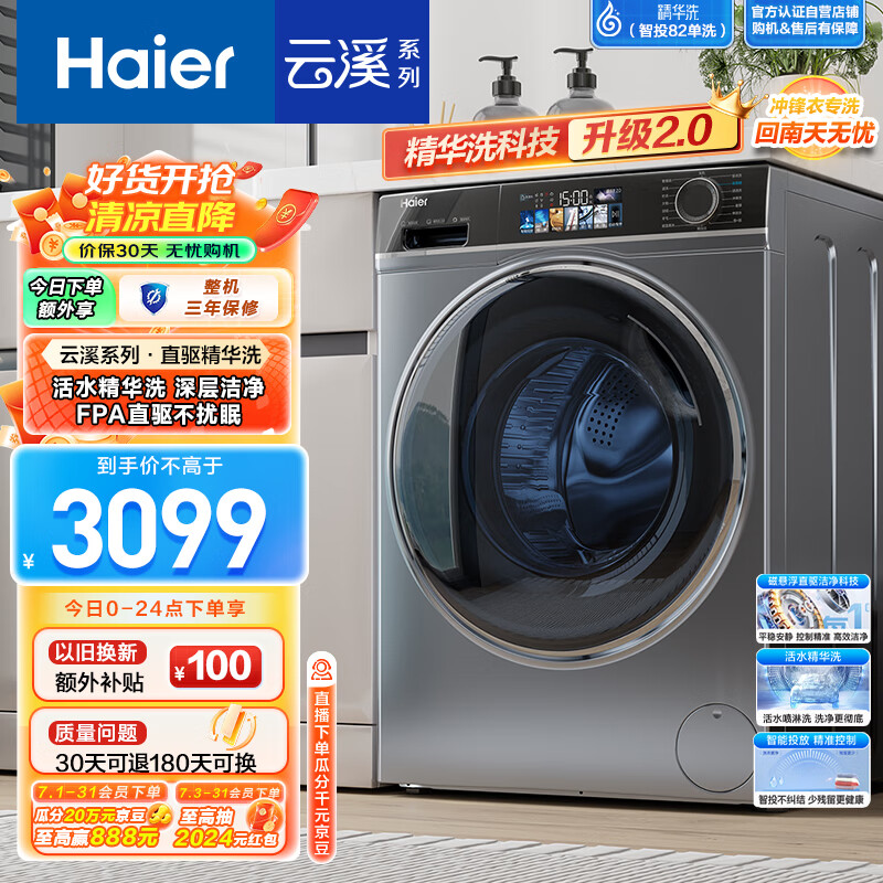 海尔(Haier)滚筒洗衣机全自动 云溪82S 10公斤大容量家用 【直驱精华洗EG100MATE82S】一级能效 以旧换新价格:3099.00元!