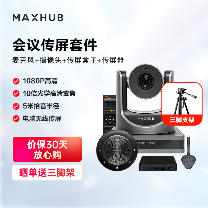 MAXHUB视频会议投屏套装5米拾音半径全向麦BM20+1080P高清云台会议摄像头SC51S+传屏盒子WB03价格:3999.00元!