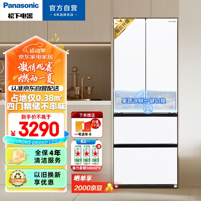 松下(Panasonic)【小海豚】400升四门法式超薄冰箱 银离子 60cm宽占地小 风冷无霜 冰纹白色NR-JD40WSA-W价格:3290.00元!