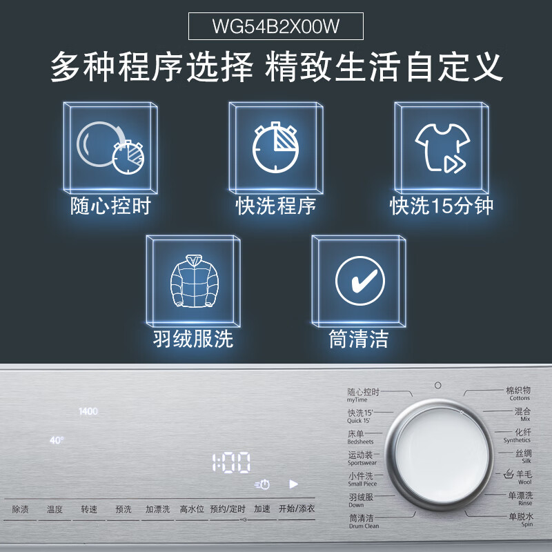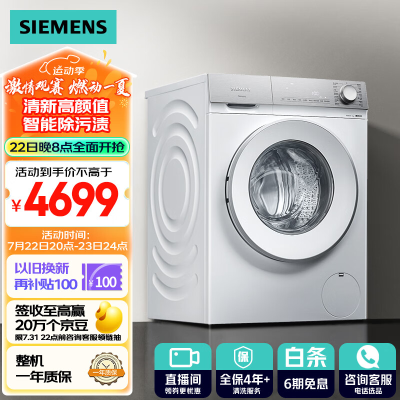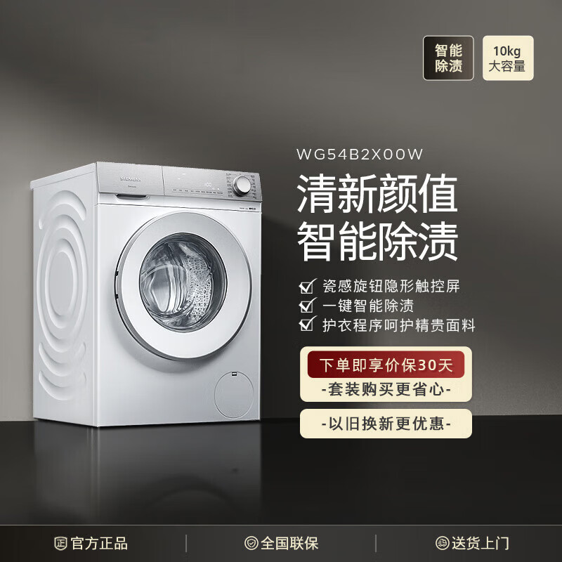 西门子(SIEMENS) 轻颜系列 10公斤滚筒洗衣机 隐形触控屏 智能除妆渍 羽绒洗 XQG100-WG54B2X00W价格:4699.00元!
