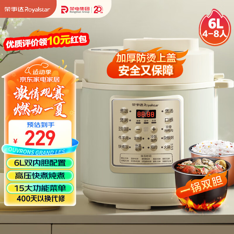 荣事达(Royalstar)电锅6L大容量全自动智能预约家用保温煲汤煮粥 面板易清洁双内胆YDG60-100A260高压锅4-8人价格:229.00元!