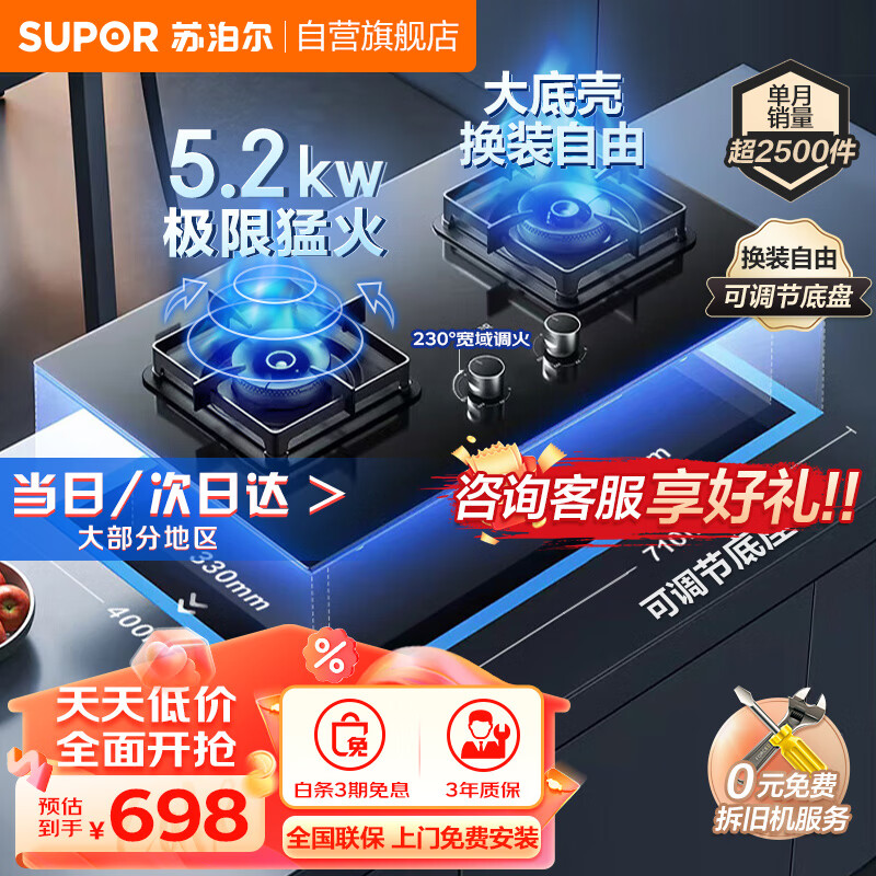苏泊尔(SUPOR)燃气灶家用天然气灶5.2KW液化气灶双灶台式嵌入式两用家庭灶具63%热效率 230°宽域控火PB15 【管道天然气】5.2KW蓝焰猛火价格:899.00元!