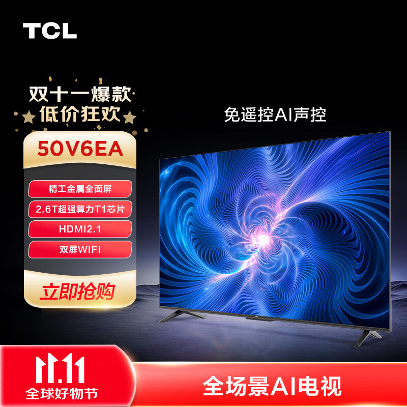 TCL电视 50V6EA 50英寸 4K超清超薄金属屏 免遥控电视 AI声控智慧屏 双频WiFi 专卖店价格:1999.00元!
