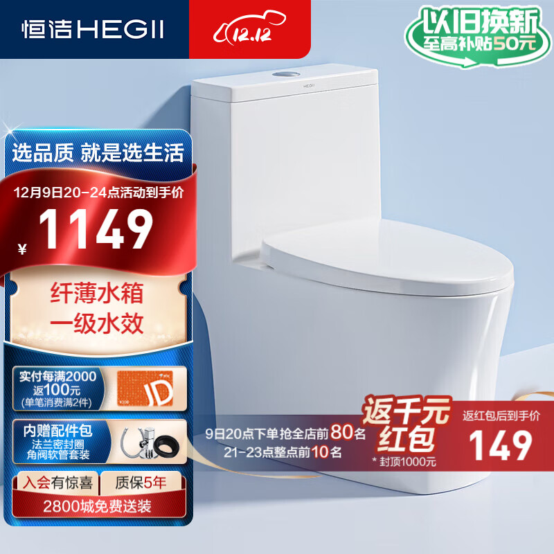 恒洁(HEGII)马桶507 三重瞬冲全包设计 轻薄节水坐便器HC0507PT-305价格:1249.00元!