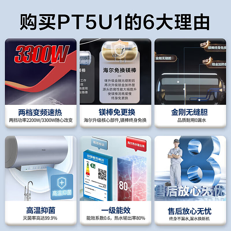 海尔(Haier)电热水器80升家用变频速热3300W储水式防电墙一级能效增容节能WIFI智控净水洗镁棒免更换PT5价格:1439.00元!