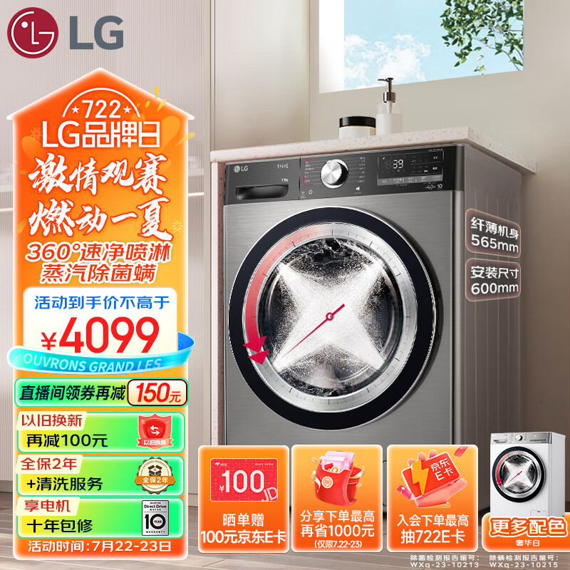 LG小旋风系列 10KG超薄家用洗衣机全自动 自动脱水 旋风速净洗 蒸汽除菌 360°速净喷淋 银 FCW10Y4PA价格:4099.00元!