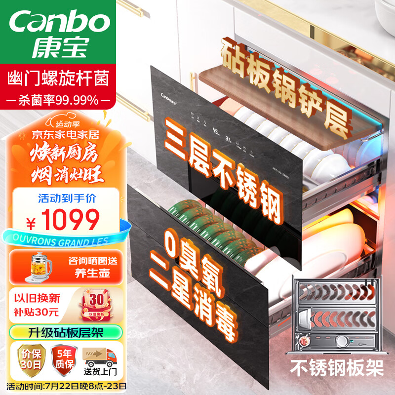 康宝(Canbo)不锈钢 消毒柜 嵌入式 家用 大容量紫外线 消毒碗柜 二星高温小型厨房碗筷餐具大升数XDZ100-EN301价格:1099.00元!