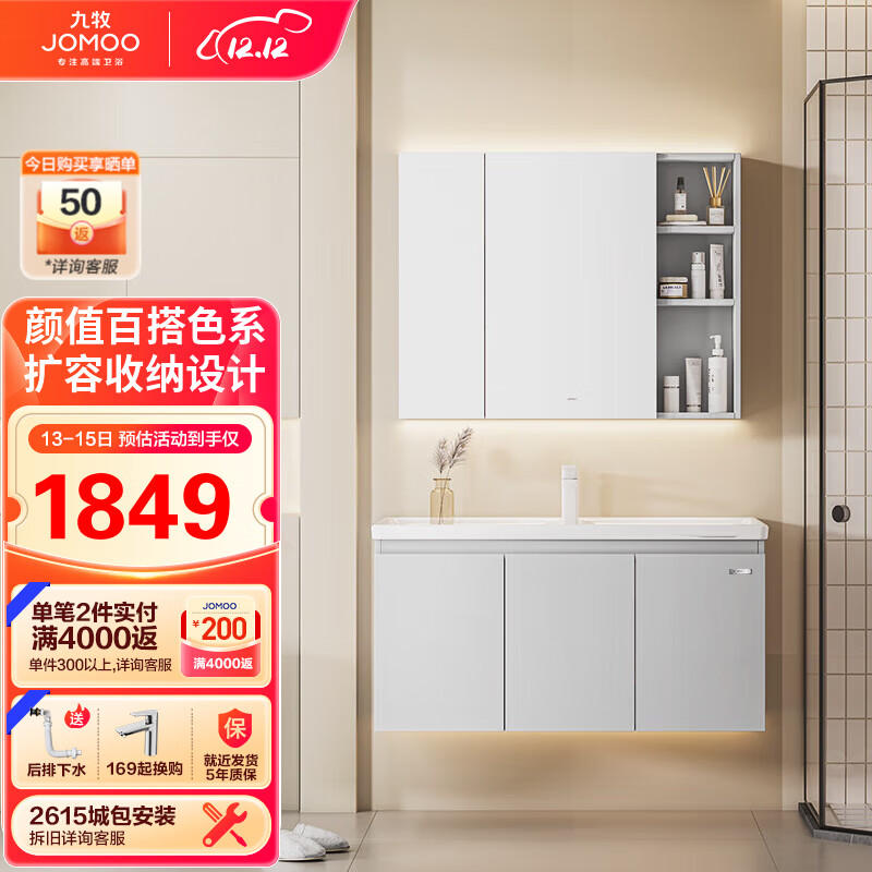 九牧(JOMOO)极简浴室柜陶瓷一体盆悬挂式洗脸洗手组合柜100cm A2721-17LD-1价格:2199.00元!