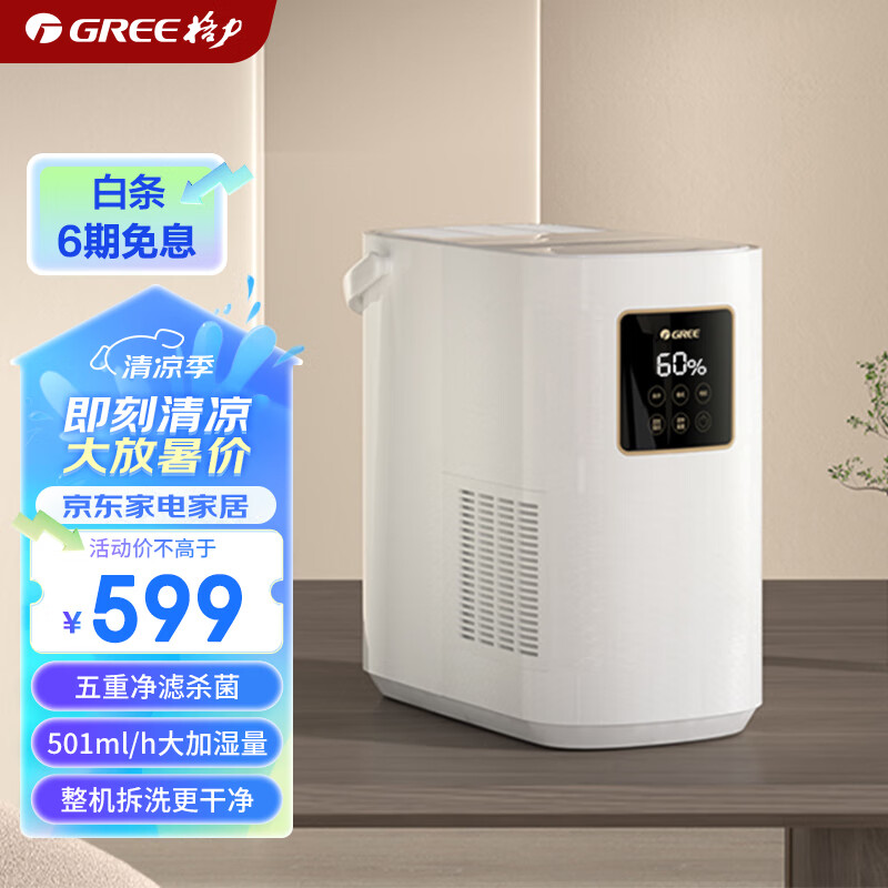 格力(GREE)无雾加湿器婴儿 静音卧室客厅家用大容量纯净式蒸发加湿器501大加湿量 四重净化 办公室母婴50x80价格:599.00元!