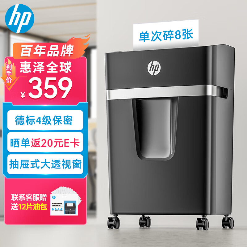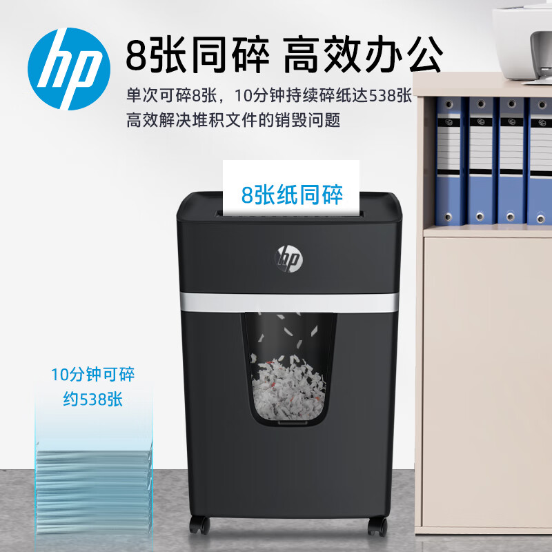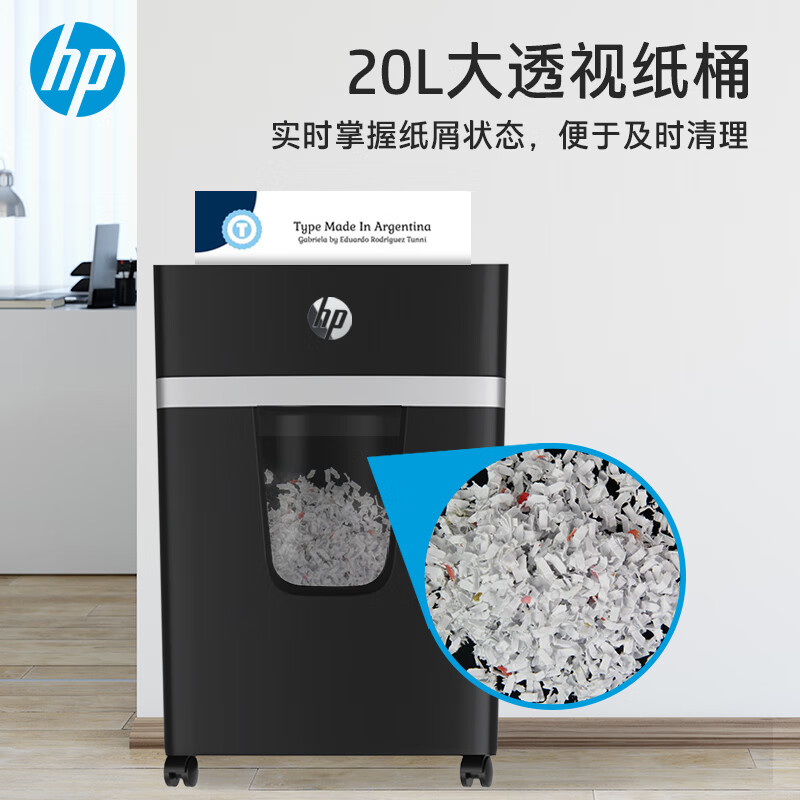 HP惠普4级多功能商用办公碎纸机 文件粉碎机(连续碎10分钟 单次8张 20L 可碎卡/订书钉)B0820CC价格:399.00元!