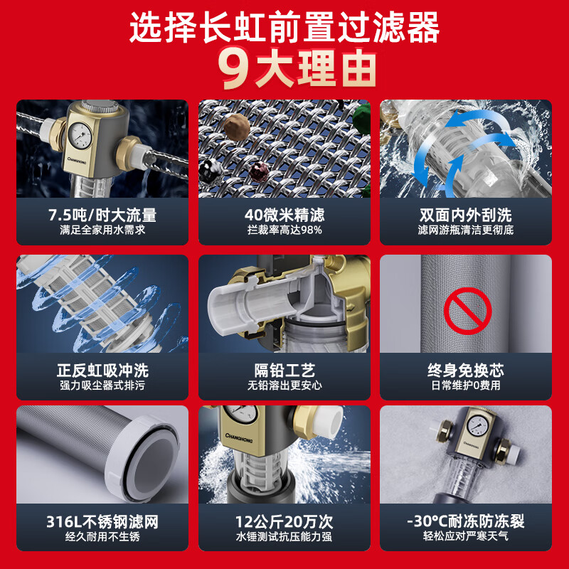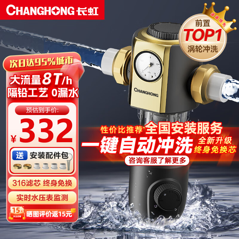 长虹(CHANGHONG)前置过滤器家用全屋7.5T正反冲洗40微米净水器水动力自动清洗刮洗中央净水机全铜大流量 上门安装【三合一涡轮冲洗】价格:475.00元!