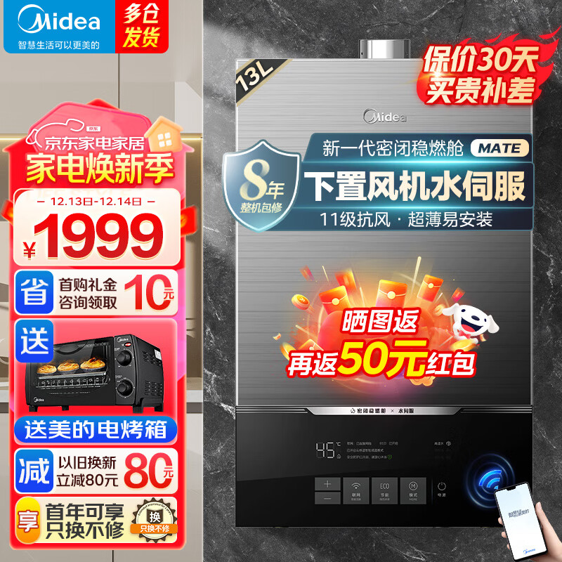 美的(Midea)13升燃气热水器下置风机天然气智控增压水伺服恒温新一代密闭稳燃舱高楼层适用以旧换新JSQ25-MATE价格:1999.00元!