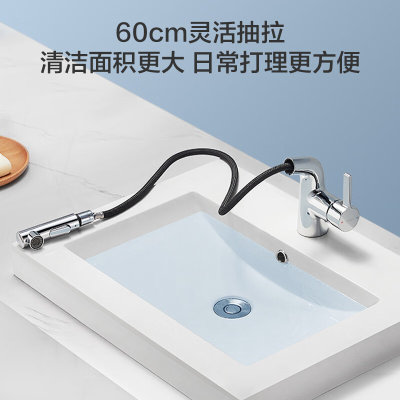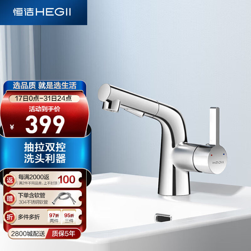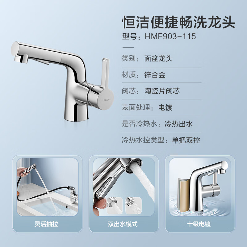 恒洁(HEGII)抽拉式面盆水龙头多功能卫生间龙头浴室台盆冷热水龙头903-115价格:399.00元!