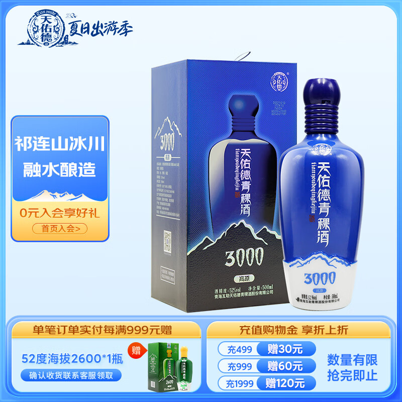 天佑德 海拔3000 清香型白酒 52度500ml单瓶装【青海青稞酒】价格:168.00元!