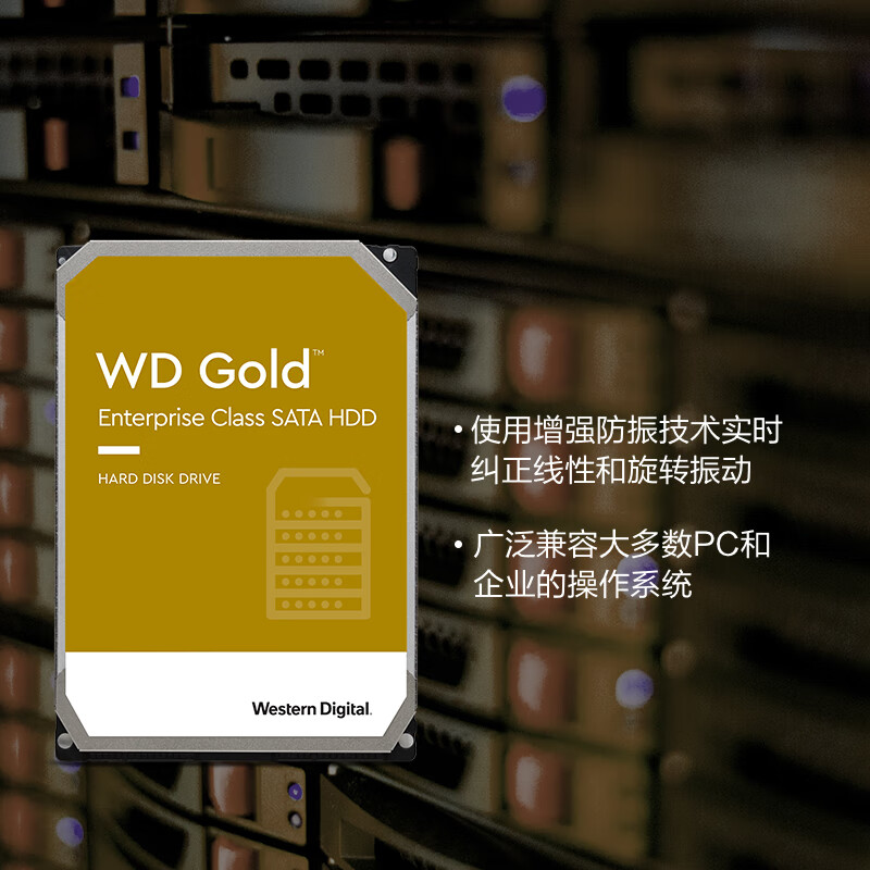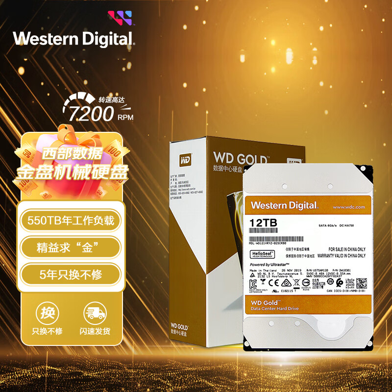 西部数据 企业级硬盘 WD Gold 西数金盘 12TB CMR垂直 7200转 256MB SATA (WD121VRYZ)价格:2699.00元!