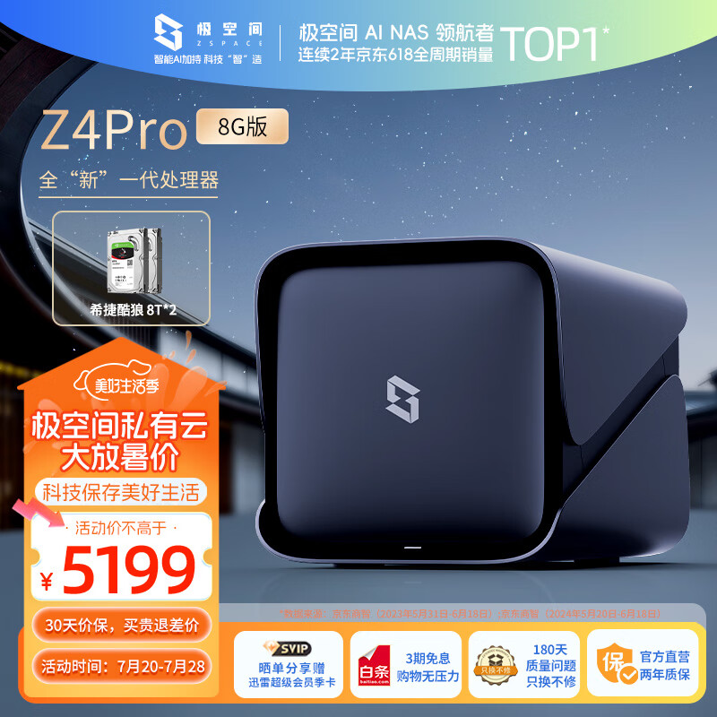 极空间私有云Z4Pro 8G版四盘位Nas网络存储家庭个人云相册备份文件同步【配2块8T希捷酷狼硬盘】钛金灰价格:5699.00元!