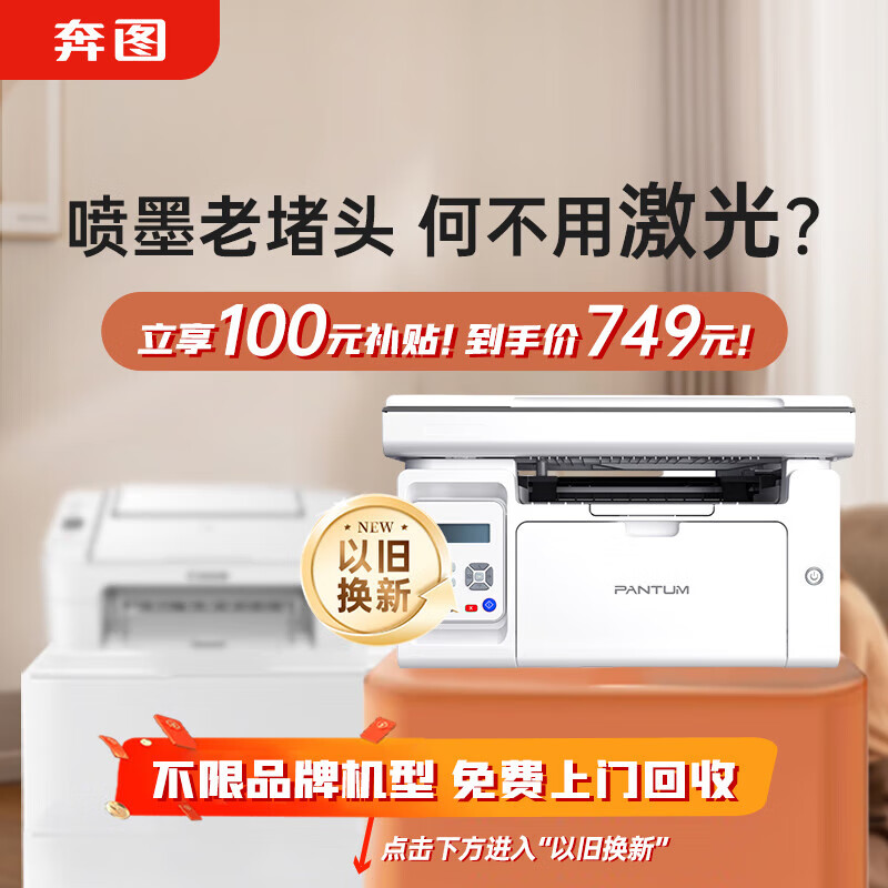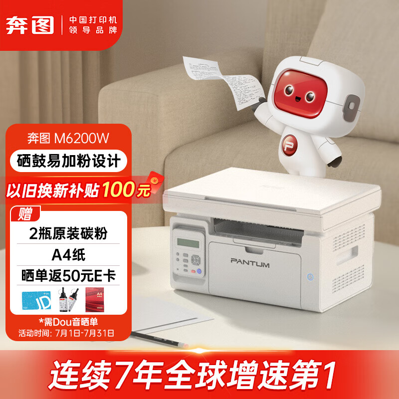 奔图(PANTUM)M6200W 黑白激光wifi无线多功能打印机 办公家用打印复印扫描一体机 硒鼓可加粉 易加粉打印机价格:849.00元!