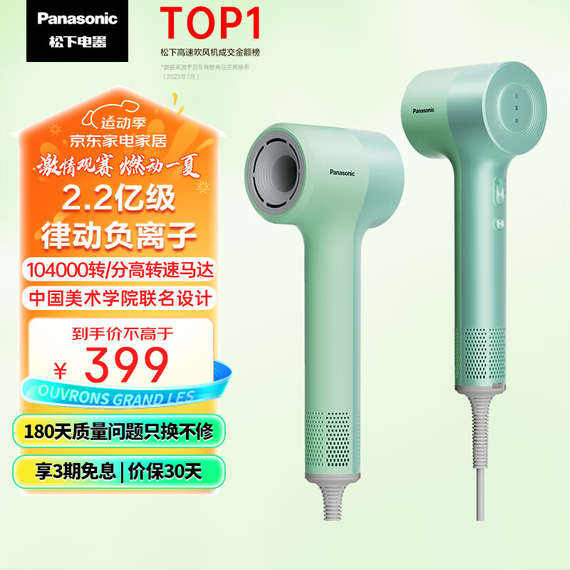 松下(Panasonic)缤纷筒高速吹风机负离子低噪音大风力家用电吹风速干护发家用大功率吹风筒情人节送礼NE7H莫奈绿价格:399.00元!