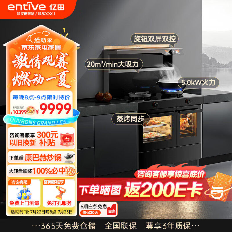 亿田JC3DL-A集成灶 蒸烤一体集成灶 蒸烤独立箱一体机 蒸箱烤箱一体灶 左排天然气价格:10399.00元!