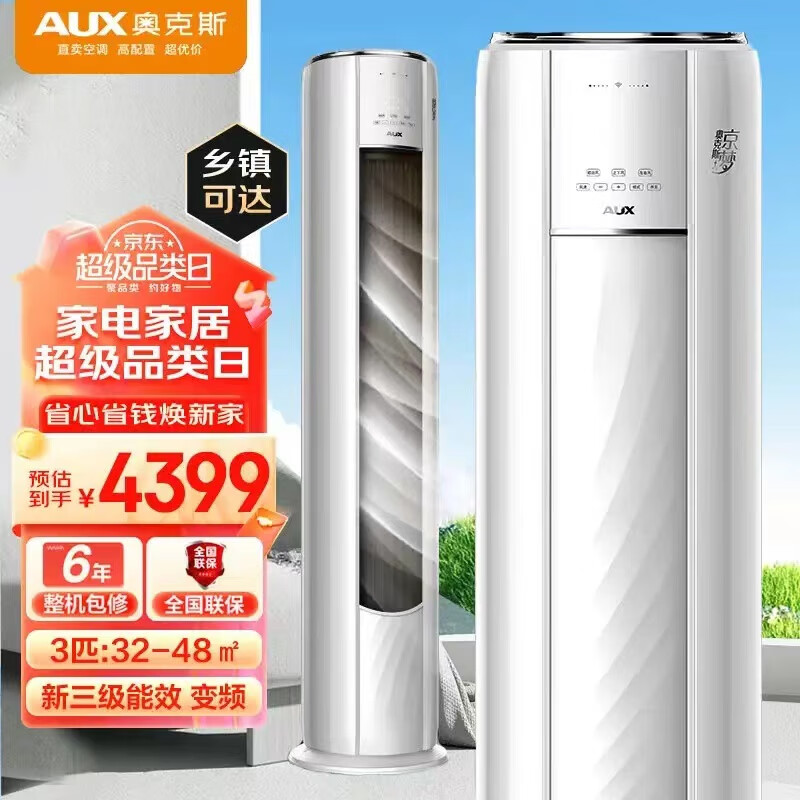 奥克斯(AUX)大3匹 空调京梦 新3级能效 快速冷暖 一键超远风 立柜式空调柜机(KFR-72LW/BpR3AQE(B3))WiFi智控价格:4499.00元!