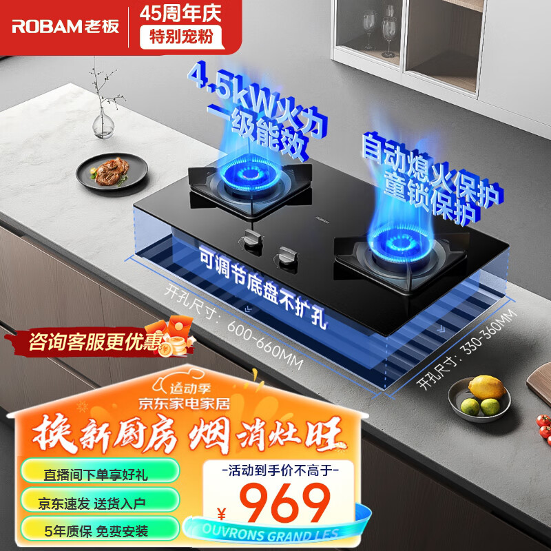 老板(Robam)JZT-30B6D家用燃气灶天然气双灶嵌入式煤气灶 4.5kW小尺寸可调节灶具灶台猛火灶燃气灶一级能效价格:1269.00元!