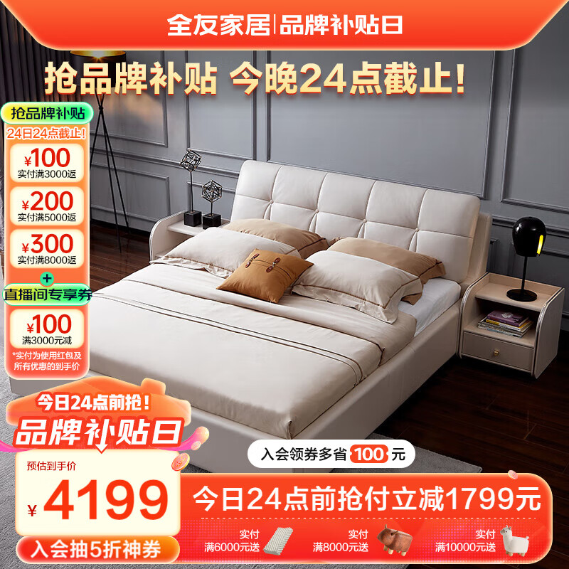 全友家居 真皮艺双人床1.8x2米现代简约主卧室头层牛皮软包大床105135价格:5998.57元!