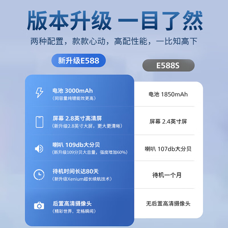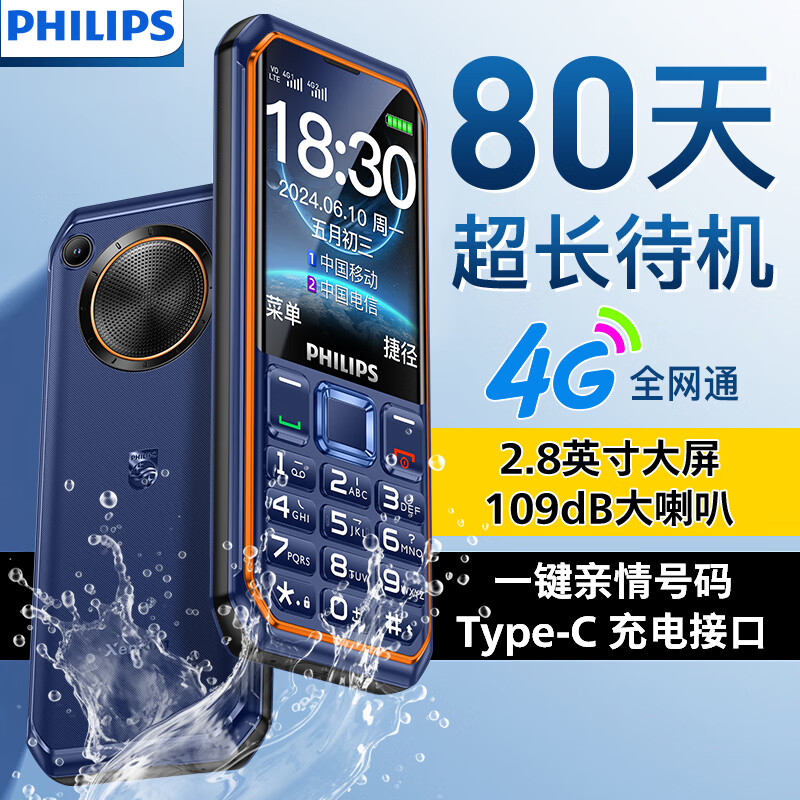 飞利浦(PHILIPS)E588 海军蓝 4G通老人手机 双卡双待超长待机 大声音三防老年机 智能按键学生功能机价格:339.00元!