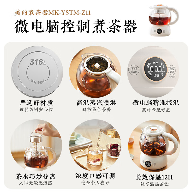 美的(Midea)煮茶器煮茶壶花茶壶 养生壶迷你恒温电热水壶蒸茶器喷淋式316L不锈钢烧水壶黑茶茶具1升YSTM-Z11价格:139.00元!