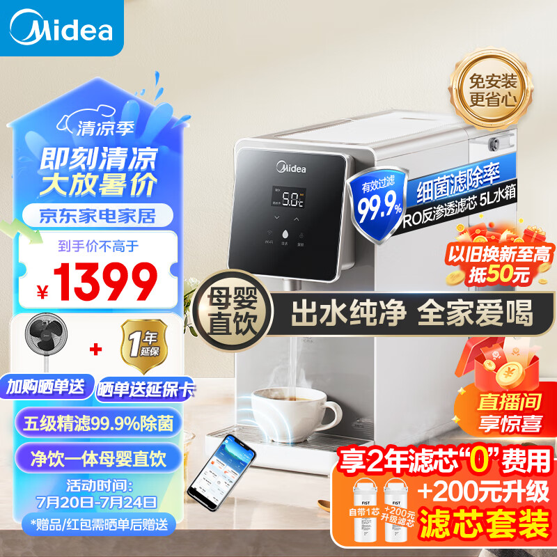 美的(Midea) 白泽台式加热净水器净饮机饮水机家用即热式直饮机净饮一体机远程智控RO反渗透免安装 JR2182T-RO价格:1399.00元!