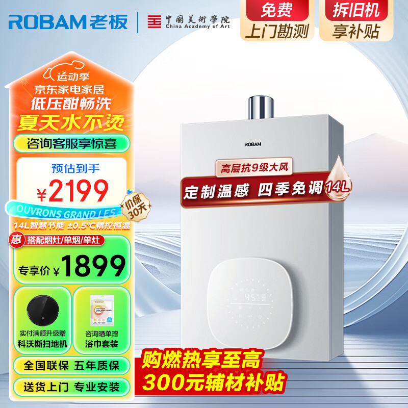 老板(Robam)小云朵14升燃气热水器天然气小尺寸智能变频恒温低水压启动水气双调降噪抗风家用强排式HT322A-14价格:2199.00元!
