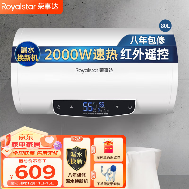 荣事达(Royalstar)电热水器 家用储水式热水器卫生间速热2000W大功率热水器 一键预约 防电 80升【遥控预约】价格:669.00元!