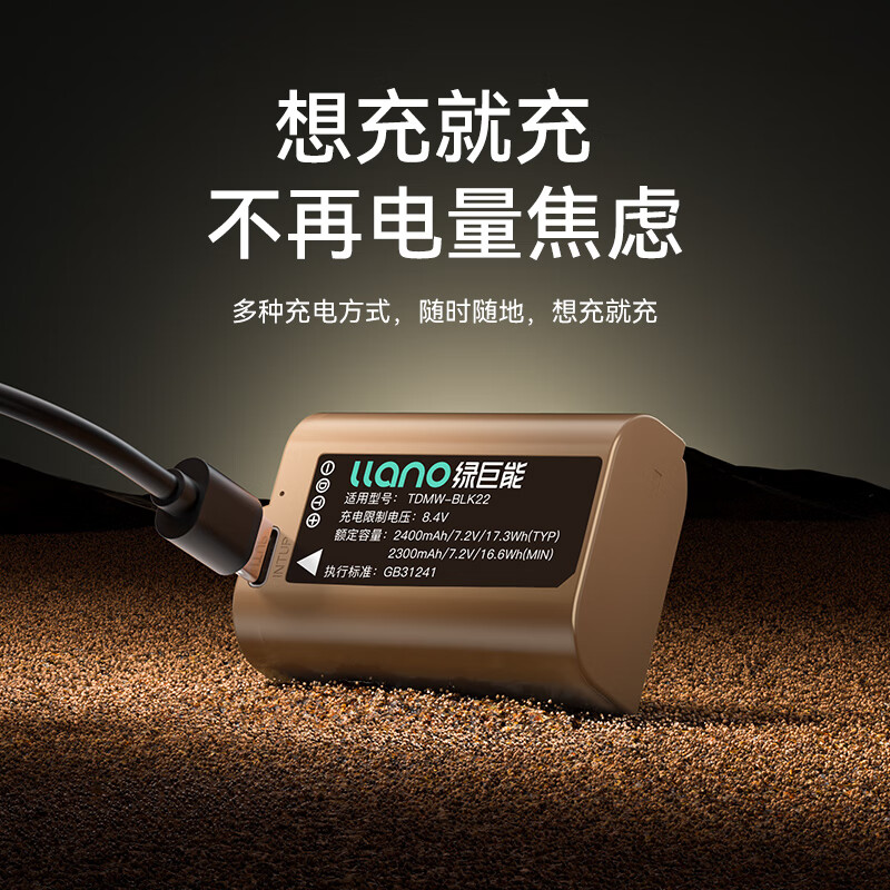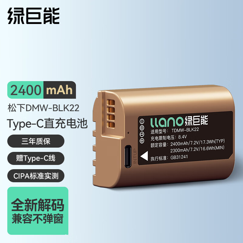 绿巨能(llano)松下DMW-BLK22相机电池S5直充电池DC-S5M2/GH6/GH5M2/S5K全画幅单反微单相机Type-C直充口电池价格:139.00元!